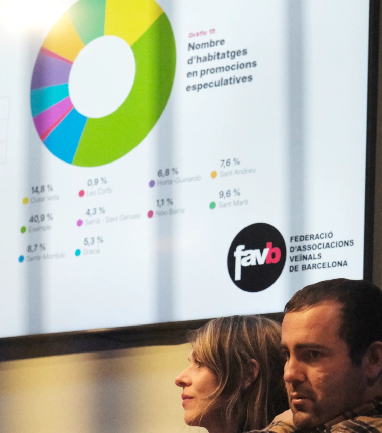 Per la seva banda, Ana Menéndez, vicepresidenta de la Favb, ha assegurat que el parc protegit està experimentant un procés de “segregació social” on les perifèries urbanes absorbeixen la major part de l’habitatge públic, mentre que al centre són “pràcticament inexistents”. En concret, l’entitat ha detectat que el 62% de l’habitatge protegit es concentra als districtes de Sant Martí, Sant Andreu i Nou Barris, especialment als barris de la Clota, la Trinitat Vella, Sant Andreu, el Poblenou i la Marina del Prat Vell. Per contra, Gràcia, les Corts, l’Eixample i Sarrià-Sant Gervasi només sumen el 7%. En aquesta línia, Jaume Artigues, portaveu de la Comissió d’Habitatge, ha remarcat que aquest fenomen es basa en una política d’habitatge basada “en el buidatge del centre i la gentrificació o expulsió cap a la perifèria”. “No és una política adscrita pels poders polítics, però sí pels poders econòmics”, ha sentenciat.