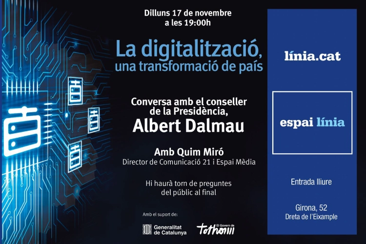 El conseller de la Presidència, Albert Dalmau, protagonitzarà el 17 de novembre a l’Espai Línia una conversa sobre la digitalització del país amb el director de Comunicació 21 i Espai.Mèdia, Quim Miró. L’acte tindrà lloc a les 19 h amb el títol La digitalització, una transformació de país, i compta amb el suport de la Generalitat de Catalunya.